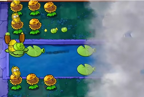 2、先在上下两侧的草坪上种植多个向日葵,在泳池中补充多个荷叶和一个玉米卷香蒲。