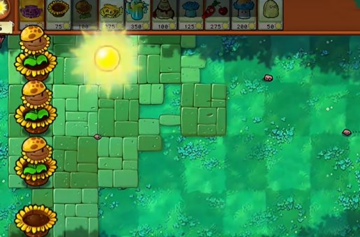 3、继续在左侧三列补充向日葵花盆和向日葵,在二路种植一个寒冰仙人掌。