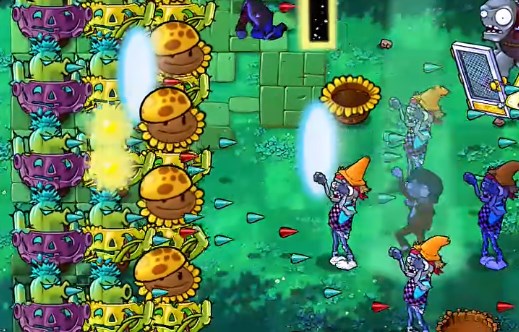 3、在传送门的所在行中分别种植一个寒冰仙人掌,并补充阳光南瓜头和忧郁南瓜头。