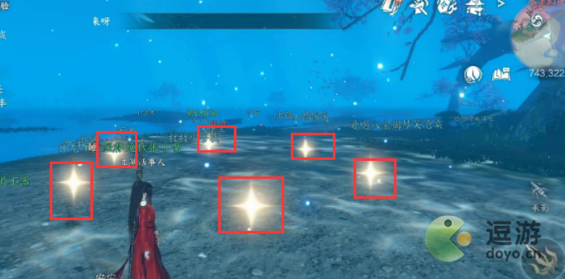 9、金色内功:镜湖坐标(320,404)、(288,372)、(154,431)、(184,583)、(427,490)、(210,381)这六个位置的花朵触碰开启限时挑战,六个都完成之后,镜湖(216,450)树上会出现一个大宝箱,可以获得金色内功跟表情动作。