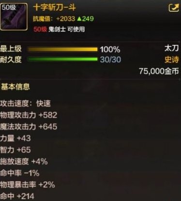 十字斩刀-斗是当前太刀史诗中给的词条最好的武器。鬼泣们如果需要PK,或者追求高攻速的手感,也可以选择十字斩刀来作为自己的毕业史诗。