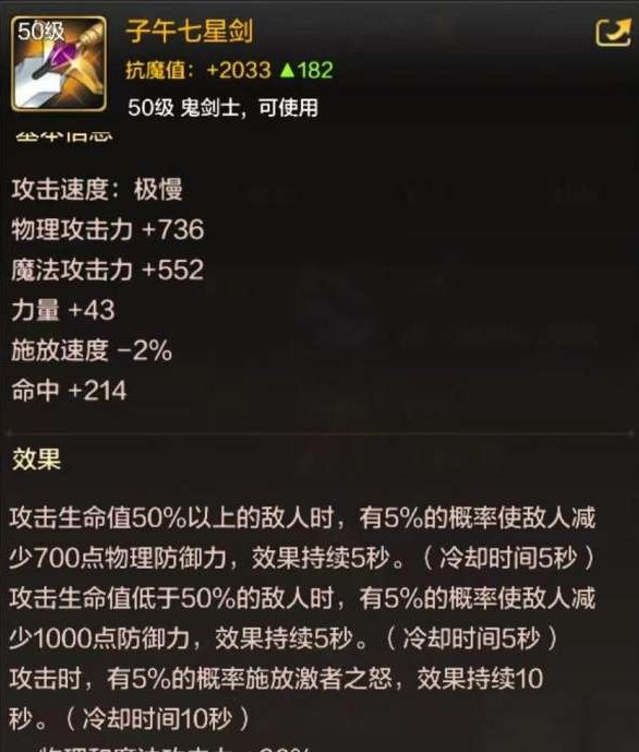 而巨剑中最强的无疑是子午七星剑。子午七星剑提供的属性是常驻的30%的物理攻击力增加,对比同样是50级史诗的狂龙之怒,后者是10%概率增加15%的物理攻击力,高下立判。