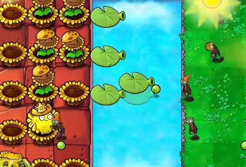 2、先在左侧种植三列向日葵花盆和阳光向日葵,在水池中种植多个豌豆荷叶。