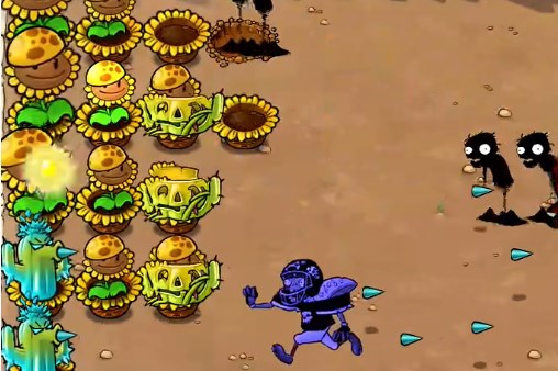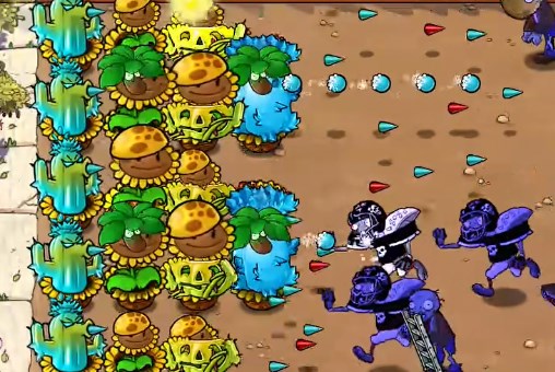 3、在左侧种植两个寒冰仙人掌,再在右侧种植三个阳光南瓜头。