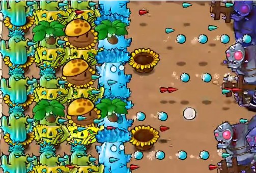 4、然后将左侧第一列的向日葵铲除,并在左侧第一列补充多个寒冰仙人掌。