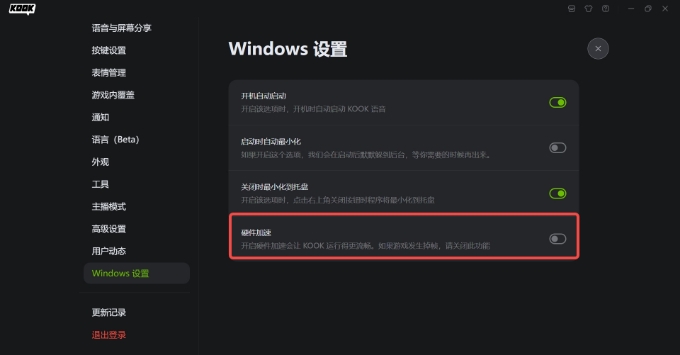 当前可通过关闭KOOK中的硬件加速解决,具体位置如下图所示\