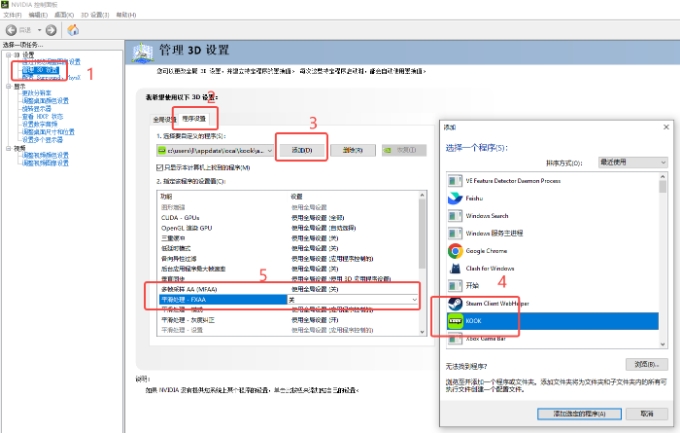 2)如下图所示,管理3D设置→ 程序设置→ 添加→ KOOK→ 平滑处理(FXAA)→ 关→ 右下角应用(保存)修改。