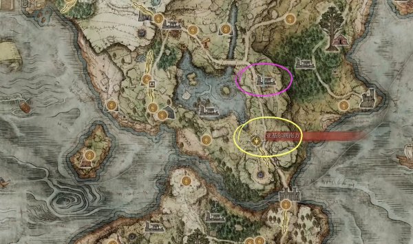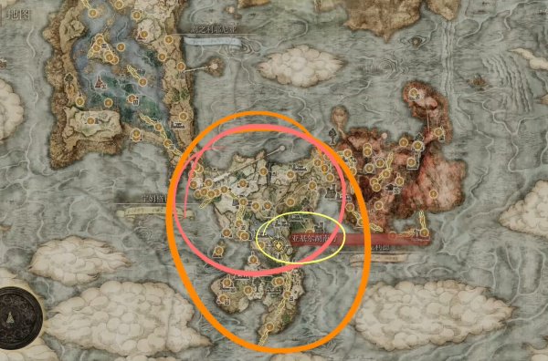 1、传送到“宁姆格福(北)”区域的“亚基尔湖南方”赐福点,目标地点就是右上方的“驿站街遗迹”