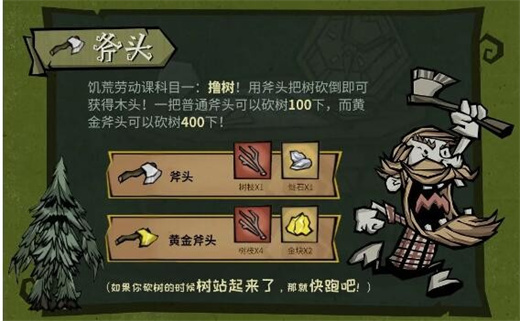 饥荒劳动课科目一:撸树!用斧头把树砍倒即可获得木头!一把普通斧头可以砍树100下,而黄金斧头可以砍树400下!