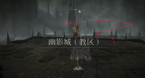 4、到达地面之后沿着下图所示路线一直走到【幽影城教区】。