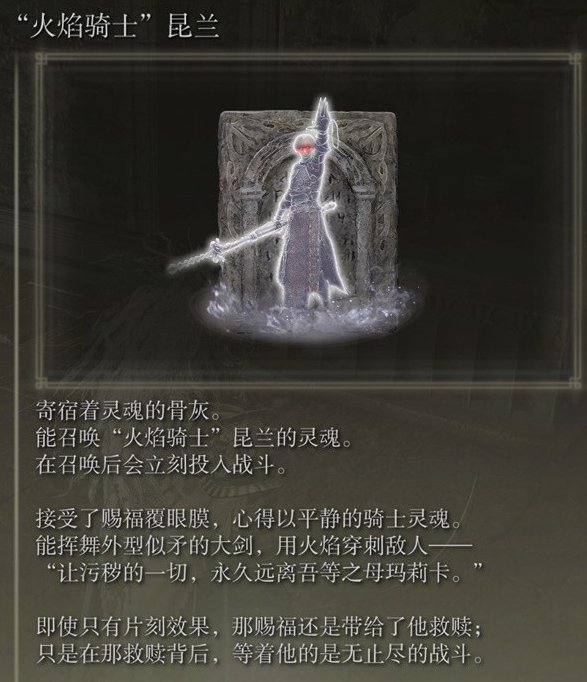 1、这个骨灰需要完成火焰骑士昆兰的支线获得,还需要使用一个赐福覆眼膜