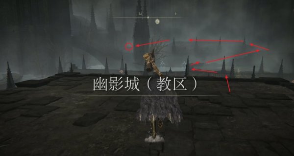 9、到达地面之后沿着下图所示路线一直走到【幽影城教区】。