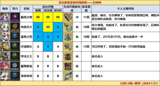 进击的堡垒中角色分为了不同职业定位,分别是:法师、召唤师、游侠、辅助、先锋,各角色之间强度有一定差距。下面带来进击的堡垒公测角色强度榜,各位朋友们可以参考一下。