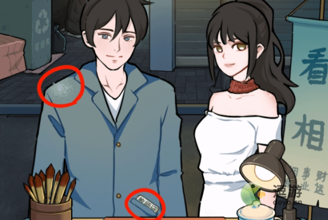 1、疯狂爆梗王算命大师,首先一男一女来看相,点击男人肩头白色粉末、口袋里的教师证