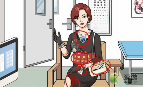 1、一代沙雕对症下药,需要找出病症并开出合适的药,首先使用放大镜查看,第一位美女,点击红色痕迹、保险单、房产证、海洋之心,上滑包包露出匕首,选择王老五照片