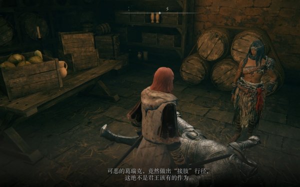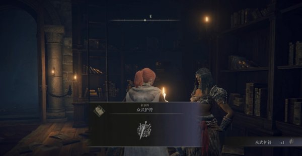 3、消灭接肢葛瑞克后返回圆桌厅堂,在书房外的走廊中可以见到她。与她交谈后可以获得众武护符。