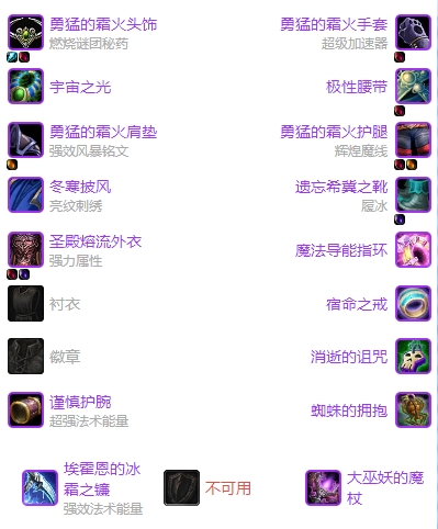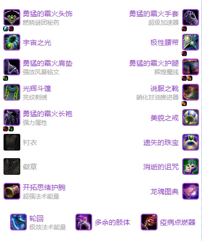 二、奥法:胸甲选择:勇猛的霜火长袍;护腕选择:开拓思维护腕;武器选择:轮回(主手)、多余的肢体(副手)
