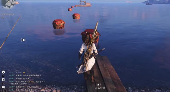 3、体验完之后我们要学习,这个湖里就会升起一列酒坛子,我们需要踩着酒坛子到最远处的船上。