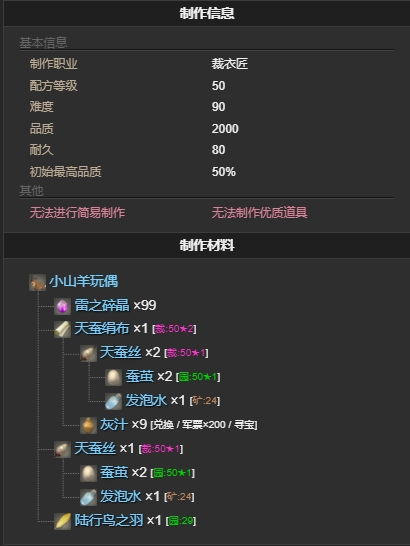 玩家生产职业裁衣匠制作出来的小宠物,需要准备材料雷之碎晶×99、天蚕绢布×1(天蚕丝×2、灰汁×9)、天蚕丝×1(蚕茧×2、发泡水×1)、陆行鸟之羽×1,职业等级达到50级,方可制作。