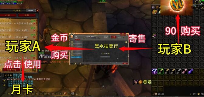 玩家B从商场以90元购买一个时光徽章,并挂在拍卖行上。玩家A在拍卖行购买后,该时光徽章变成玩家A的月卡。