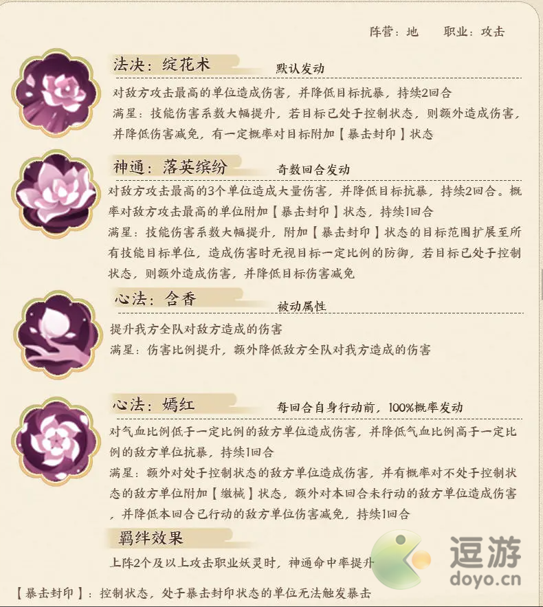 1、曼陀罗技能效果总结:不让高攻暴击,8星后可以扩大至3个攻击最高的卡牌,降低对方防御比例,提高自身C位输出,对地方血量低于50%的卡牌进行追击伤害。