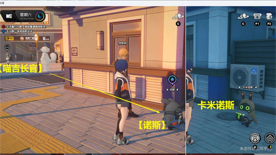 3.当完成【探索委托-一桩疑案两段录像三人在场】副本后,追踪任务来到【光映广场-喵吉长官】下图位置和【诺斯】对话后,该任务结束,然后将游戏时间调整到第2天后,再次来到下图位置和【诺斯】对话后;