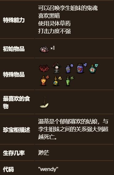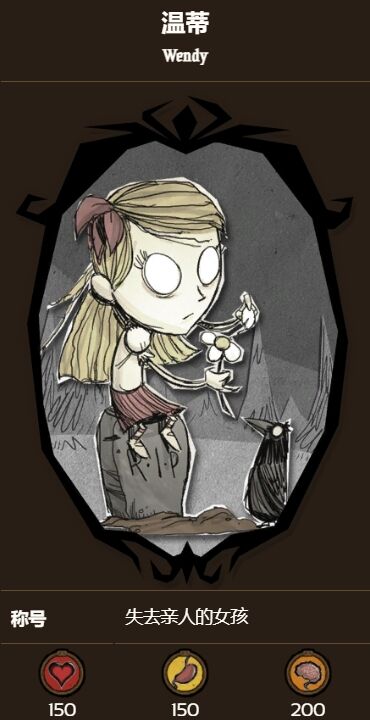 1.温蒂理智下降更慢的特性和在阿比盖尔辅助下不俗的战斗力让她成为清理远古遗迹的最佳人选之一。尽管温蒂装备着高礼帽在夜间或洞穴时,理智值图标上不会显示代表下降的箭头,但实际上理智还是会缓慢下降。