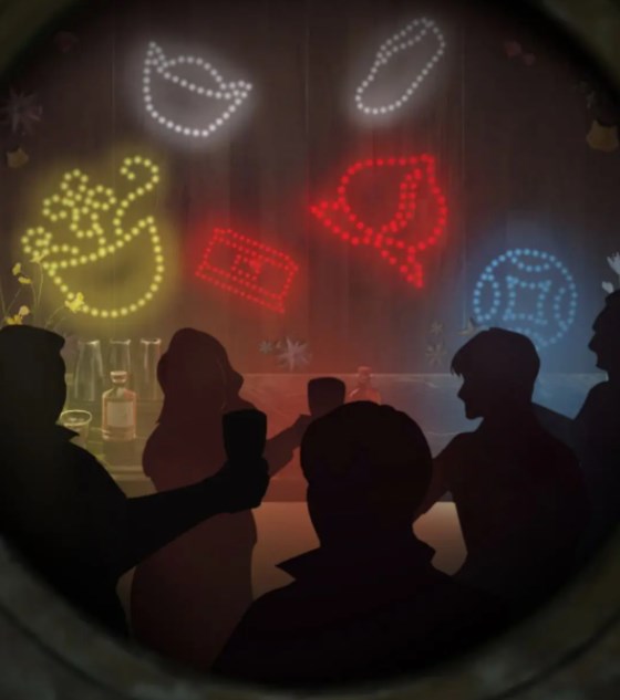 桥两边的小纸人手里都有物品,根据物品按照彩灯变颜色