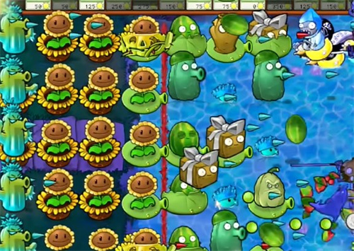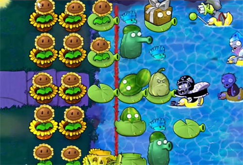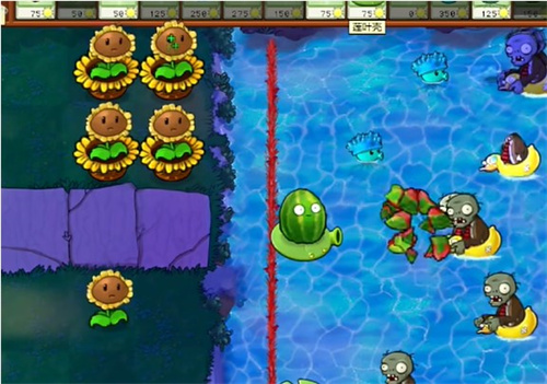 2、先在水池中种植两个寒冰小喷菇,在左侧种植三个受伤的向日葵。