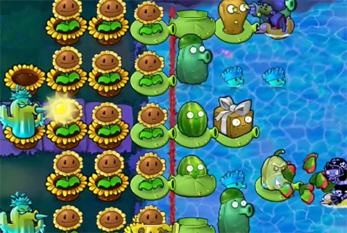 7、最后在警戒线右侧多个坚果类植物,并在左侧补齐一列寒冰仙人掌即可过关。