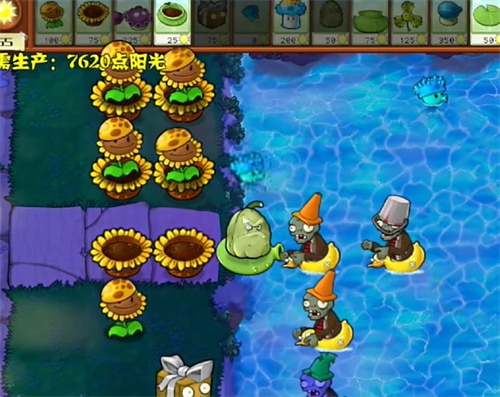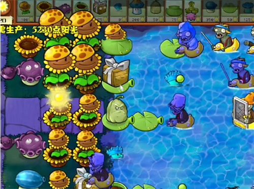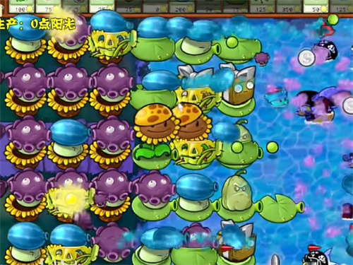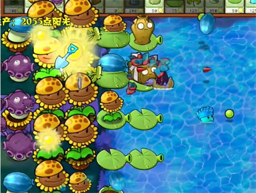 5、铲除左侧的阳光向日葵,种植多个大喷菇投手。