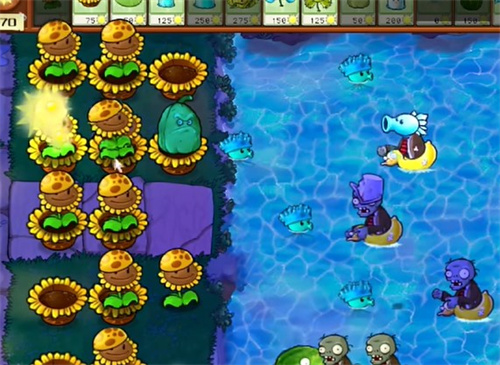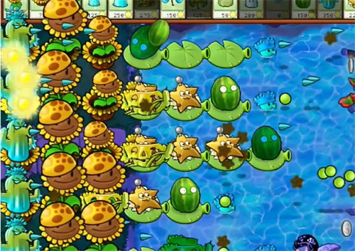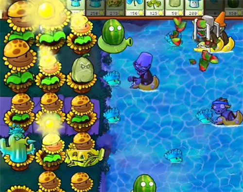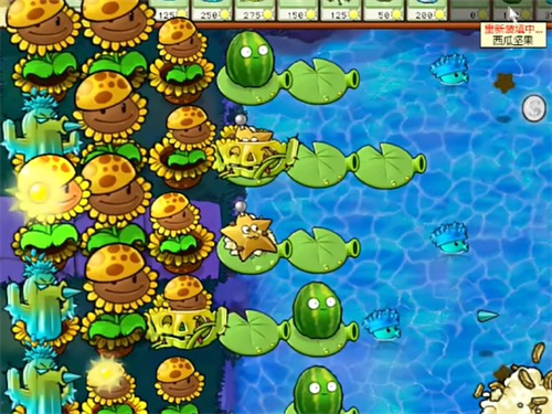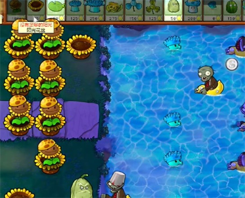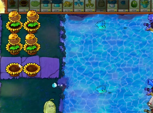 3、在水池中种植三个寒冰海兵菇,在左侧补充向日葵。