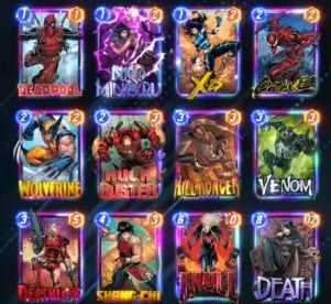 1.该构筑包含三张三池卡:死侍,毒液,死亡女神;一张四池卡:纳尔;两张五池卡:妮可,X23。这些四五池卡缺一不可,少了任何一张都会令你的摧毁卡组大打折扣。