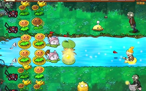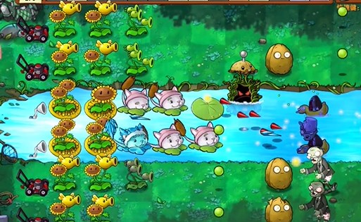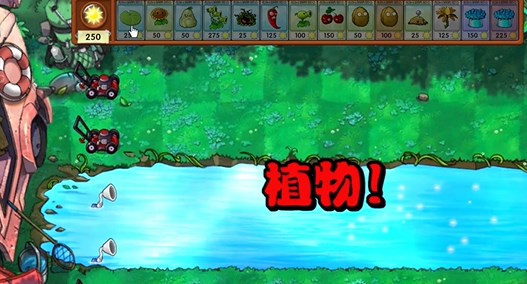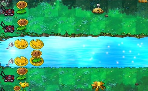 2.在地图左侧种植多个向日葵,在泳池中种植两个猫蒲和荷叶。