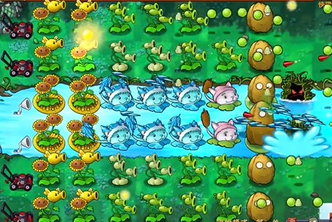 3.继续在泳池中种植多个猫蒲并进行融合,在左侧合成多个豌豆向日葵。