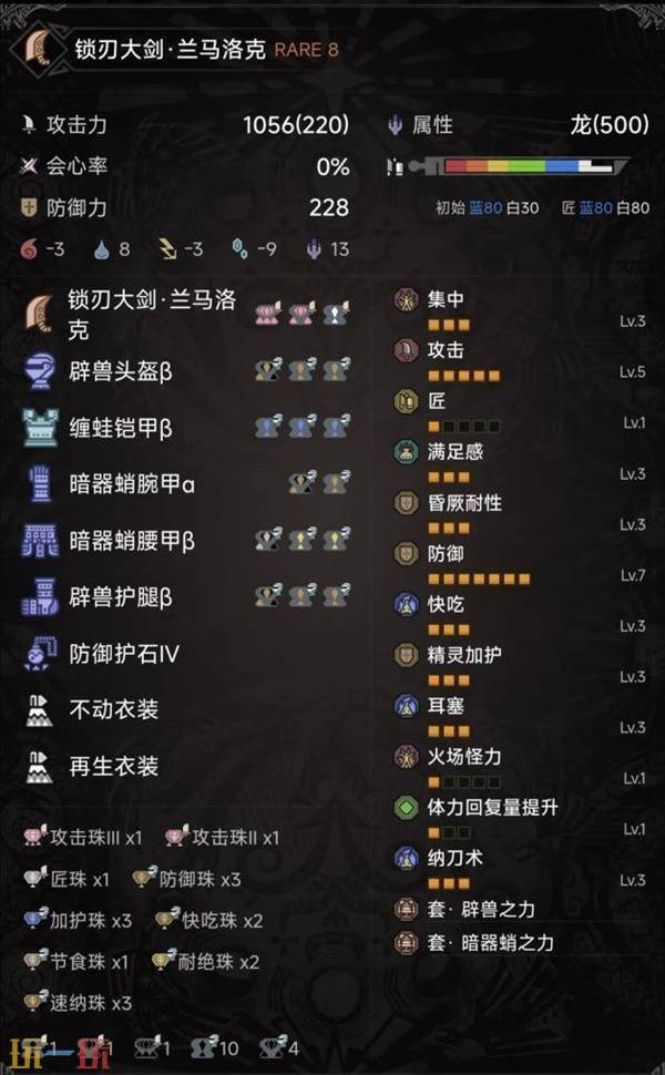 耐火珠/耐水珠/耐冰珠/耐雷珠/耐龙珠:各3级,提升对各类属性攻击的抗性。