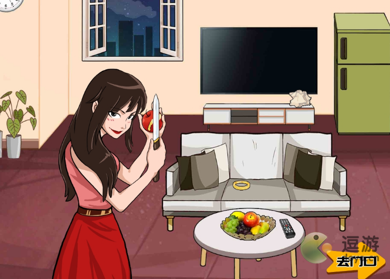 4、将沙发上的桌子给妻子,移动水果刀到水果上