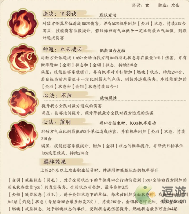 3、金乌技能效果总结:叠加金羽(每回合真伤)和金翎(概率叠灼烧),然后等羽毛叠加到极致数量后,神通第二回合爆发输出,运气好满羽毛状态,输出直接炸裂。