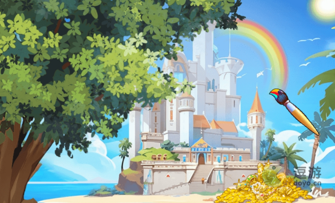 3、接着来到城堡场景,点击右上角的太阳、左下角的花、大树、画笔、城堡、金矿