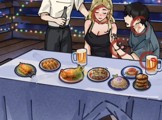 2、在照片中找到女生害羞表情、脖子红色印记、杯子上的口红印、手上的头绳,上滑桌布找到女生的脚