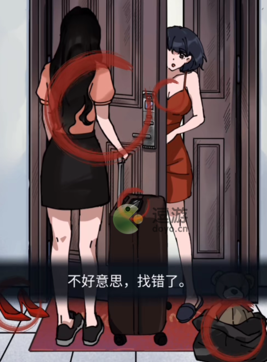 4、来到门口,点击高跟鞋、密码锁,上滑垃圾袋找到玩具熊,点击女生的手机找到电话关机,点击门敲门出现一个女生