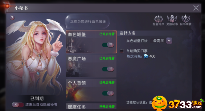 购买任意月卡,即可赠送智能小秘书,她将能够对游戏内大部分基础功能进行在线挂机管理与执行,功能定制与设计十分全面。玩家可通过设置来委托智能小秘书进行鼓舞、购买等操作,魔幻世界的冒险将变得更加轻松更加有趣。同时,使用智能小秘书挂机,也不会影响玩家的正常聊天和养成等大部分操作。另外,各类活动也已同步开启上线,欢迎玩家们进入游戏中查看。