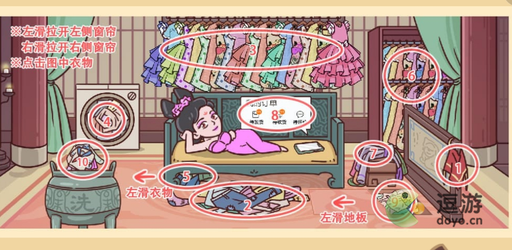 3、点击洗衣机里的衣服、凳子上的衣服,左滑床下的衣服