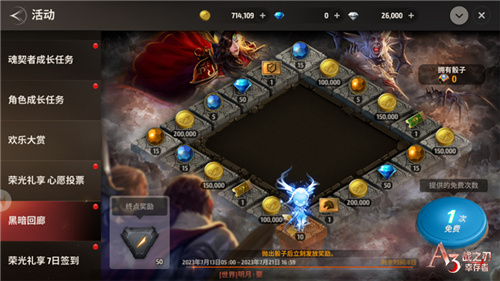 8月16日当天,黑暗回廊活动开启,通过每日登陆以及完成【每日任务】,可以获得骰子,勇士可以投掷骰子,根据获得点数进行移动,并触发事件,有概率获得蓝钻、灵魂行者高阶召唤券、副本入场券等丰富奖励。快扔出手中的骰子,命运早已将厚礼摆在您前进的道路上!
