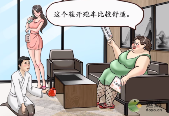 1、疯狂梗传办公室关系,需要给办公室的三人穿上衣服,首先老板:男士浴袍、枸杞茶、钢丝球、黑丝、高跟鞋