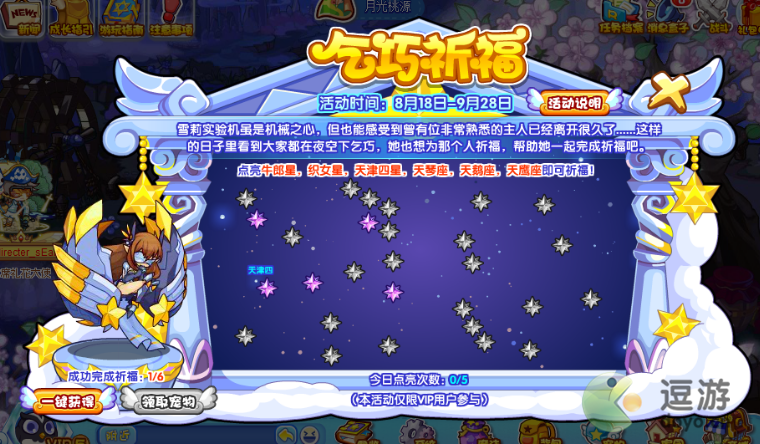 1、活动需要在界面中的未点亮星星里找出牛郎星、织女星、天津四星、天琴星、天鹅座、天鹰座,建议把星星全部点亮也能完成,就是完成时间会久一点