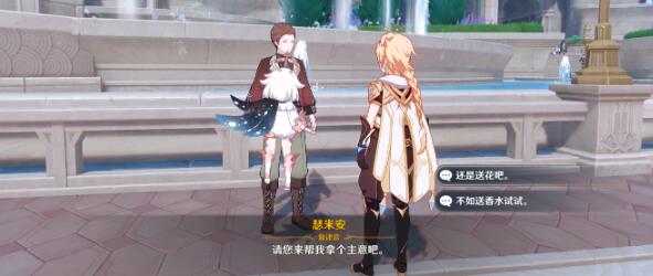 为了安慰女友,瑟米安询问我们该送什么礼物;这里有送花和送香水2种分支;