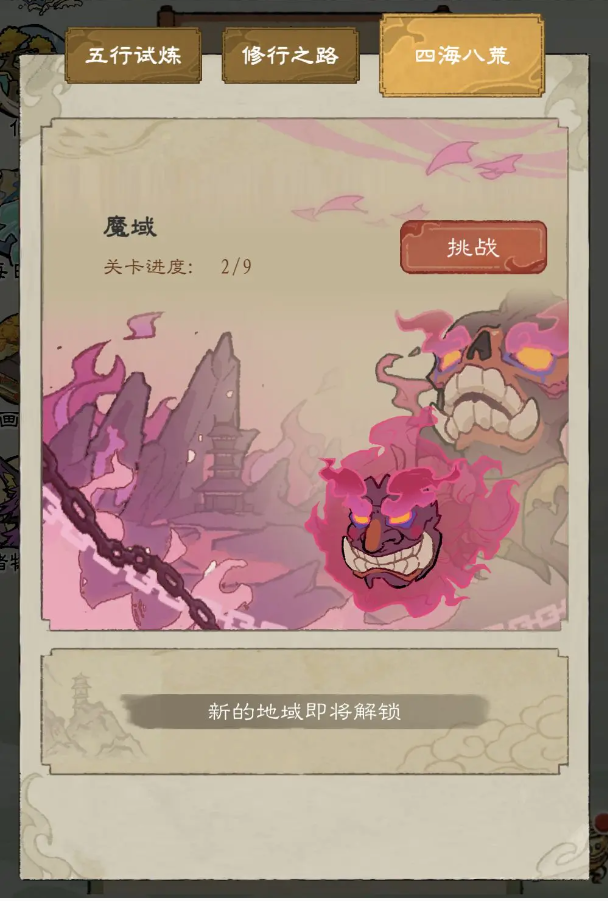 解锁后可在关卡类型选择界面切换为“四海八荒”后挑战魔域