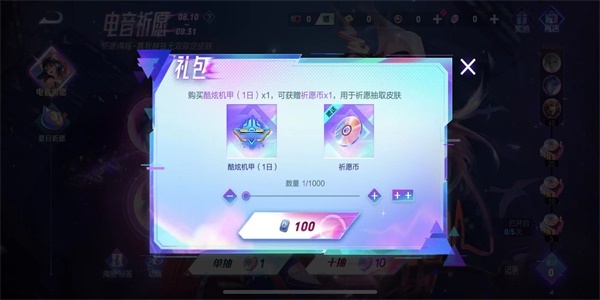 3、我们点击单抽就可以看到100券可以购买到购买能炫机甲1日x1,可获增折愿币x1,用于折愿抽取皮肤。