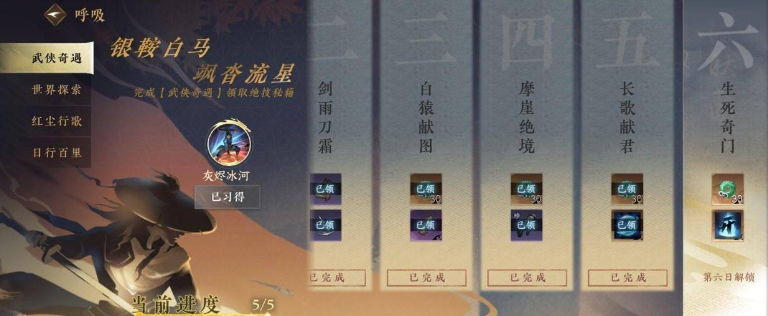 在武侠奇遇里可以找到任务摩崖绝境,需要先完成前置任务才可以领取,在累计做完五个任务之后可以获得绝技:灰烬冰河。